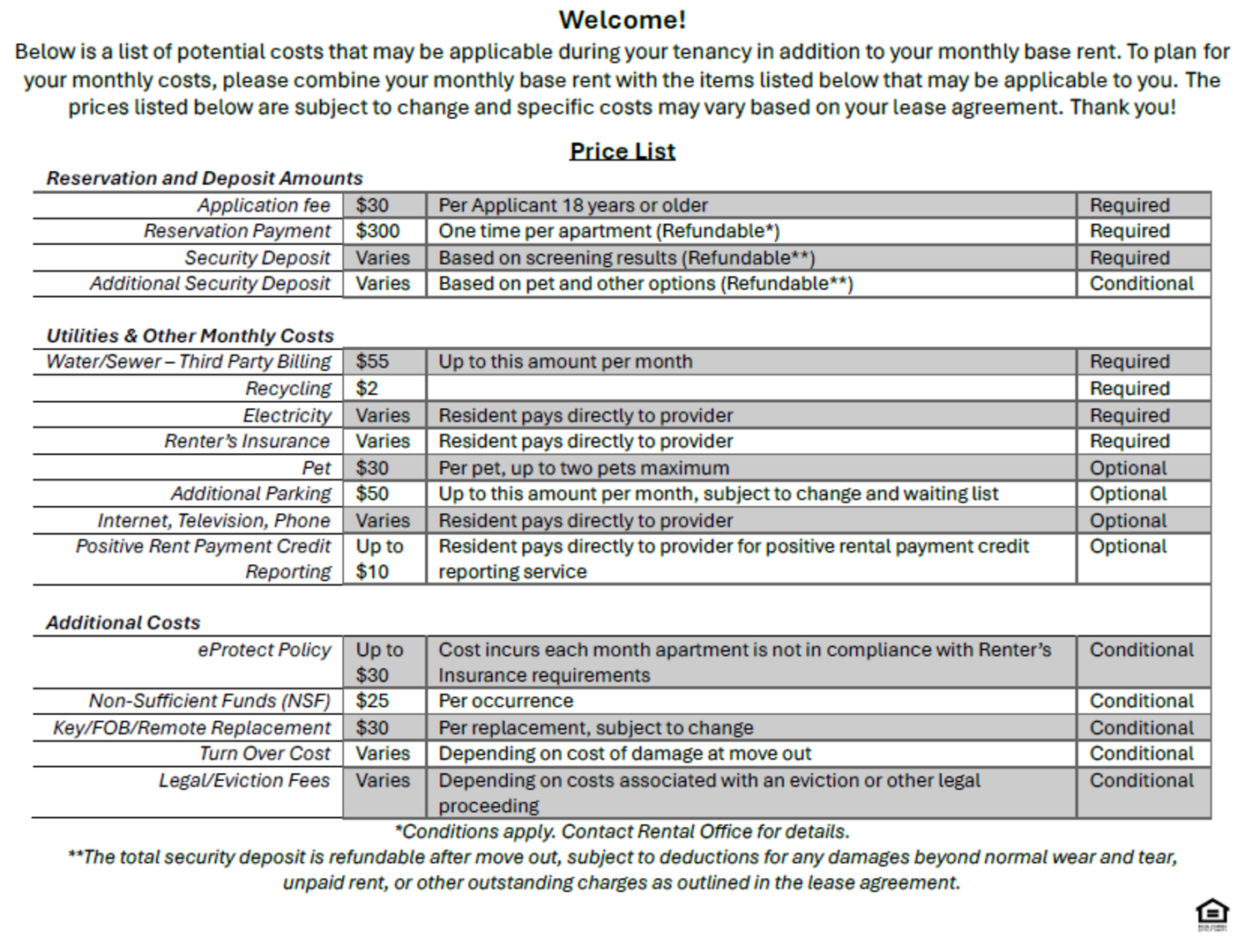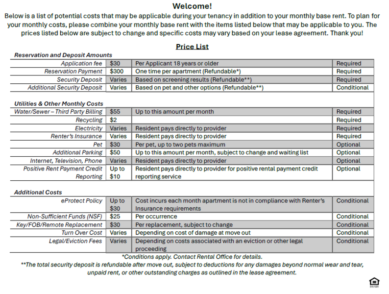 Price shown is Base Rent. Residents are required to pay the following: Application Fee ($30.00 Per Applicant 18 years or older, One-Time, At Application), Reservation Payment ($300, One time per apartment, Refundable*), Security Deposit (Varies, Based on screening results, Per Apartment, Refundable**), Additional Security Deposit (Varies, Based on pet and other options, Refundable**, Water/Sewer (Up to $55 per month per apartment, Utility, Usage Based, Nonrefundable), Recycling ($2 per month per apartment, if applicable, Nonrefundable), Electricity/Gas (Varies, Usage Based, Utility, Resident pays directly to provider), Renter’s Insurance (Varies, Resident pays directly to provider). Optional charges that may be applicable to the resident are as follows: Pet ($30 Per pet per month, Up to two pets maximum, Nonrefundable), Parking/Carport/Garage/Storage (Varies per property, per month, Subject to change, Nonrefundable, Refundable** deposit may apply), Internet, TV, Phone (Varies, Utility, Resident pays directly to provider), eProtect Policy (Up to $30, Cost incurs each month apartment is not in compliance with Renter’s Insurance requirements, Nonrefundable), Non-Sufficient Funds (NSF) ($25 Per occurrence, Nonrefundable) Key/FOB/Remote Replacement (Varies per property, Per replacement, Subject to change, Nonrefundable), Positive Rental Payment Credit Reporting ($2.00 per month per resident, Resident pays directly to CredHub, Nonrefundable), Turn Over Cost (Varies, Depending on cost of damage at move out), Legal/Eviction Fees (Varies, Depending on costs associated with an eviction or other legal proceeding). *Conditions apply. Contact Rental Office for details. **The total security deposit is refundable after move out, subject to deductions for any damages beyond normal wear and tear, unpaid rent, or other outstanding charges as outlined in the lease agreement.